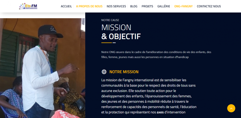 Notre Agence digitale Webcom-Guinée a finalisé le projet de création d’un site web bidimensionnel pour Fangny Groupe; un site internet qui couvre à la fois le volet entreprise Fangny Multiservices et un volet purement humanitaire c’est à dire l’ONG Fangny International.